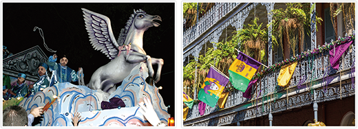 復活祭を前に47日間の食事制限を行うカトリックの慣習、四旬節。毎年2~3月には、その前準備として肉や油をたっぷり食べる飽食の週が設けられ、飽食の週の最終日には「マルディグラ(肥沃な火曜日)」と呼ばれる祝祭が行われます。アメリカのニューオーリンズでは毎年、この時期になると街が紫・金・緑のマルディグラカラーに染まり、複数のカーニバルが行われます。道を練り歩く巨大なフロートから群衆に向けてカラフルなガラス製のビーズ(マルディグラビーズ)の首飾りが投げ込まれ、観光客を楽しませています。