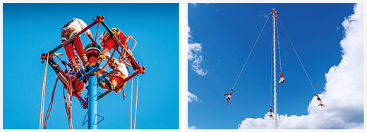 ダンサ・デ・ロス・ボラドーレス(通称:フライング・インディアン)は、メキシコを中心とした南アメリカ各地で行われるユニークな成人の儀式です。対象となるのは18歳を迎える男子。地面から伸びる約30~90メートルのポールに5人1組で上り、1人は頂上で太鼓の演奏をし、他の4人は逆さ吊りで落下傘のように回転しながらくるくるとポールを降りてきます。命綱は足首に結ばれた1本のロープのみ。さながらサーカスのように豪快な儀式は観光客にも愛され、2009年よりユネスコ無形文化遺産に登録されています。