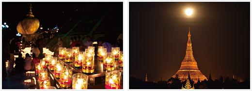 ダディンジュ祭り(Thadingyut)は、ミャンマーに住む仏教徒にとって重要な年中行事のひとつです。毎年、僧侶たちの修行期間である「雨安居(うあんご)」が終わるタイミングに合わせ、太陰暦タディンユット月の満月の日(西暦では10月~11月ごろ)に行われます。お祭りの起源は、天界での説法を終えて地上に戻るお釈迦様を迎え、降臨を祝う故事から。人々は、お釈迦様から地上がよく見えるように灯火を捧げたと伝えられており、現在でもダディンジュ祭りの日には住宅や寺院が無数の灯りで彩られます。